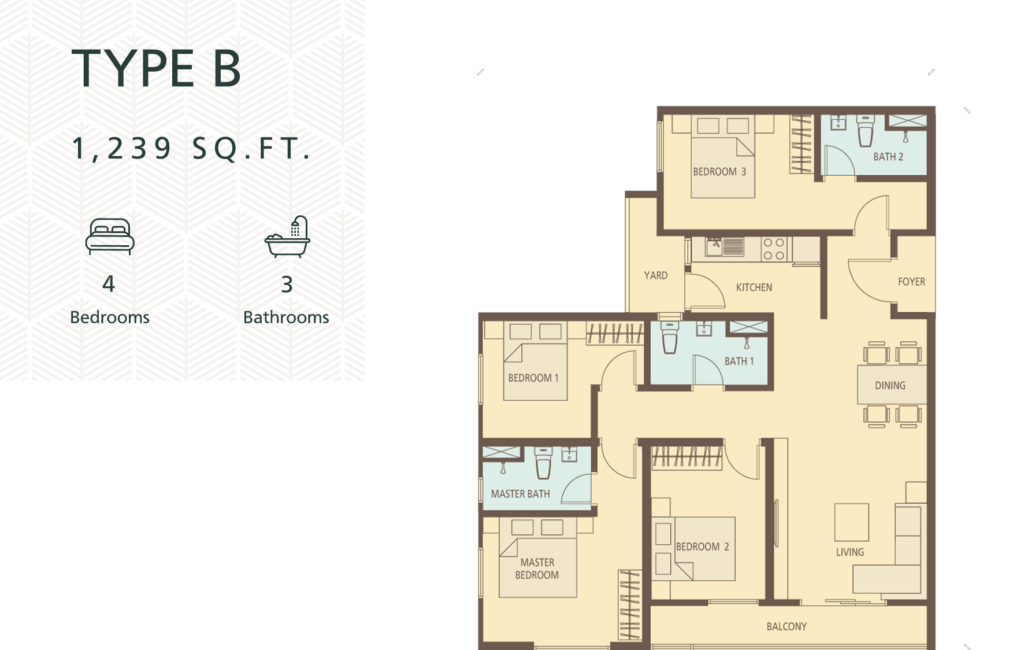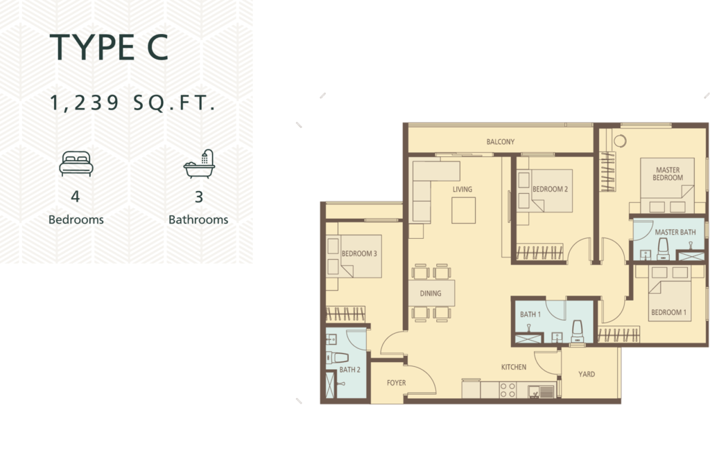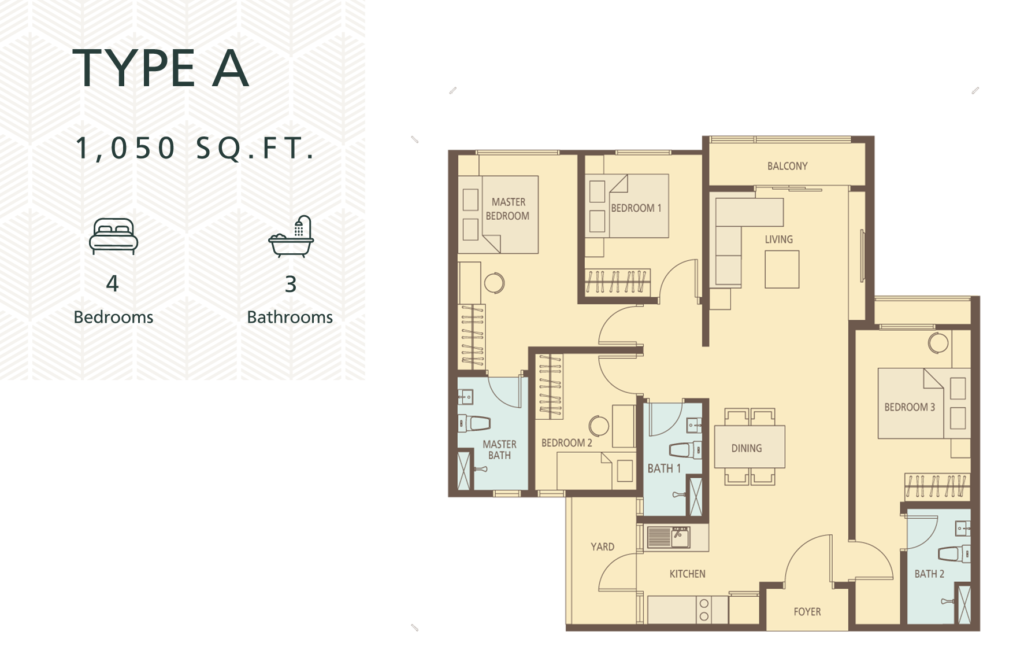 1050sf – 1239sf, all 4 bedrooms 3 bathrooms. Some units come with 3 parkings*.