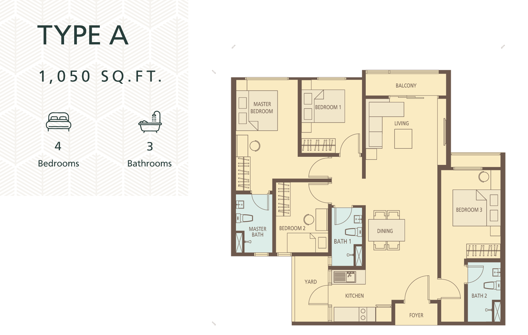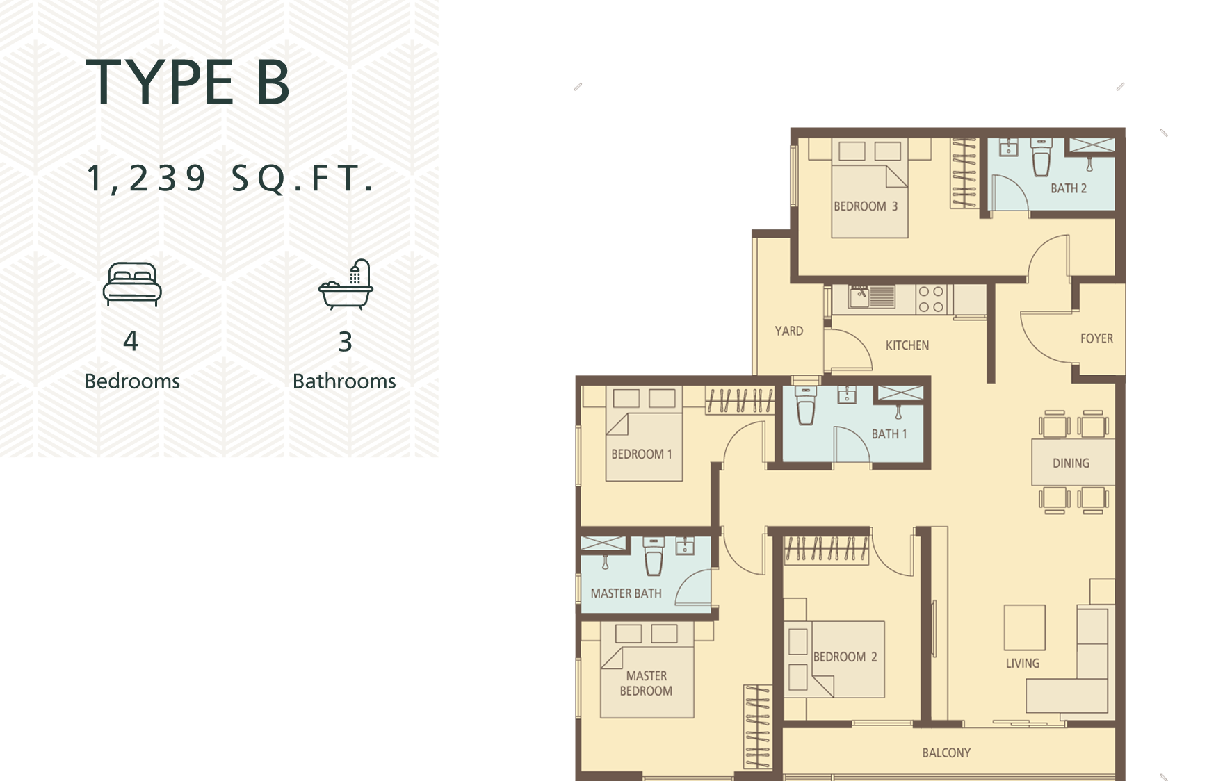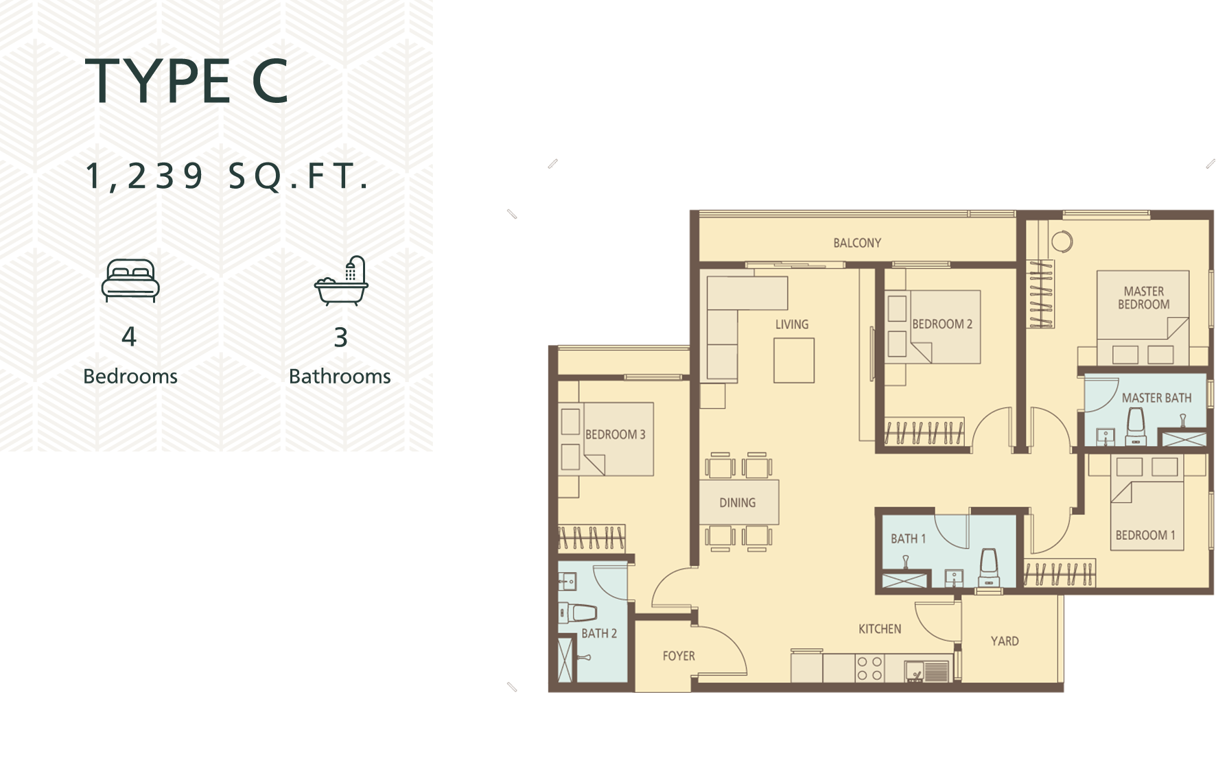 1050sf – 1239sf, all 4 bedrooms 3 bathrooms. Some units come with 3 parkings*.