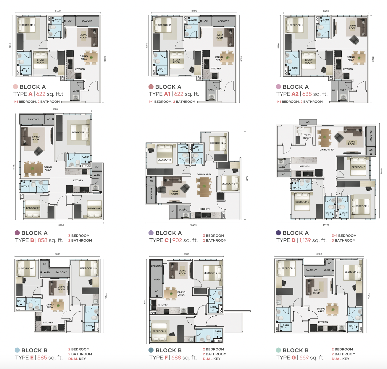 There are 10 different layouts to choose, from 2 beds to 4 beds. Below are the layouts:-